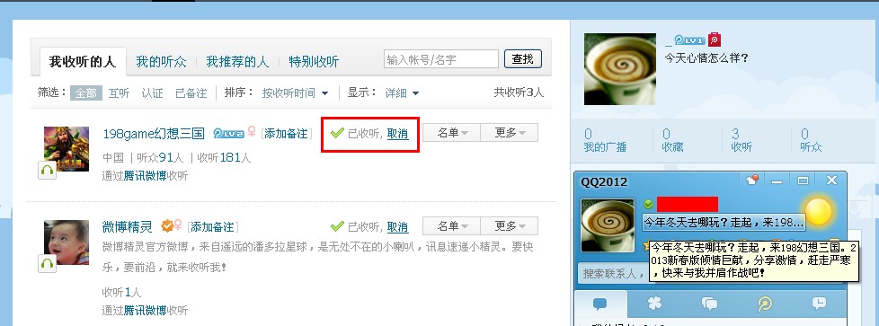 活动内容:在活动期间,玩家需要按照活动要求修改QQ个性签名,并收听198game《幻想三国》的官方微博。(《幻想三国》官方微博地址:http://t.qq.com/hxsg198)