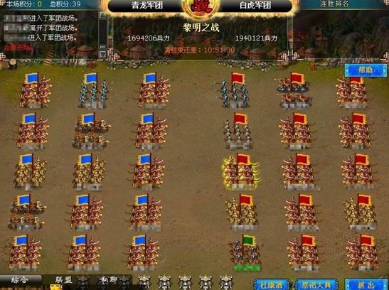 30人混战模式的“军团争霸”,给人热烈的战斗体验。爱上玩家《幻想三国》沙场点兵,谁主沉浮?玩家报名进入军团战,系统将随机分为青龙、白虎两大阵营。绷紧你的神经,看准你的对手,在屏气凝神中静待倒计时。5,4,3,2,1!鼠标狂点你看中的对手,拼的是网速,拼的是实力!胜利在握,敌方阵营中还有几个屹立不倒的英雄?看准对手,再一次发动攻击!军令决定了你能攻击的次数,参赛人数越多,能攻击的次数越多,一人单挑,决战为王!