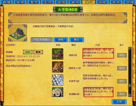 在198game爱上玩家《幻想三国》网页游戏新版本中,根据不同的兵种设置了不同的体力科技,用以提高军队的生命力。如羽林军的体力科技羽威,虎豹骑的体力科技是虎威,陷阵车的体力科技机械轴,火弩车的体力科技动力机等,每提升1级,军队的生命力就会上升3%,最高等级皆为40级。体力科技不断升级,军队的生命力就会越来越强大,抗攻打能力、耐久力也就随之增强。
